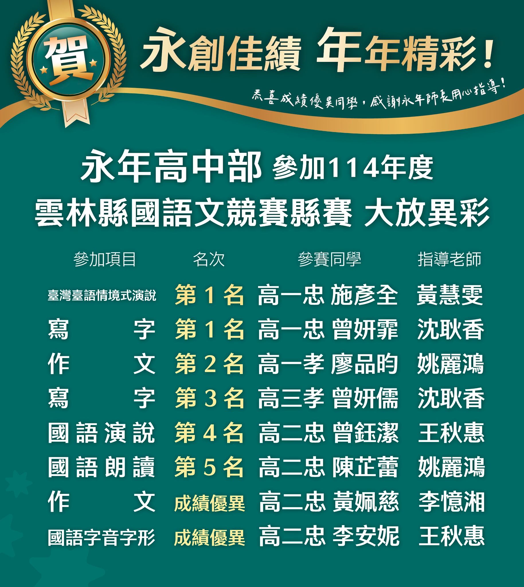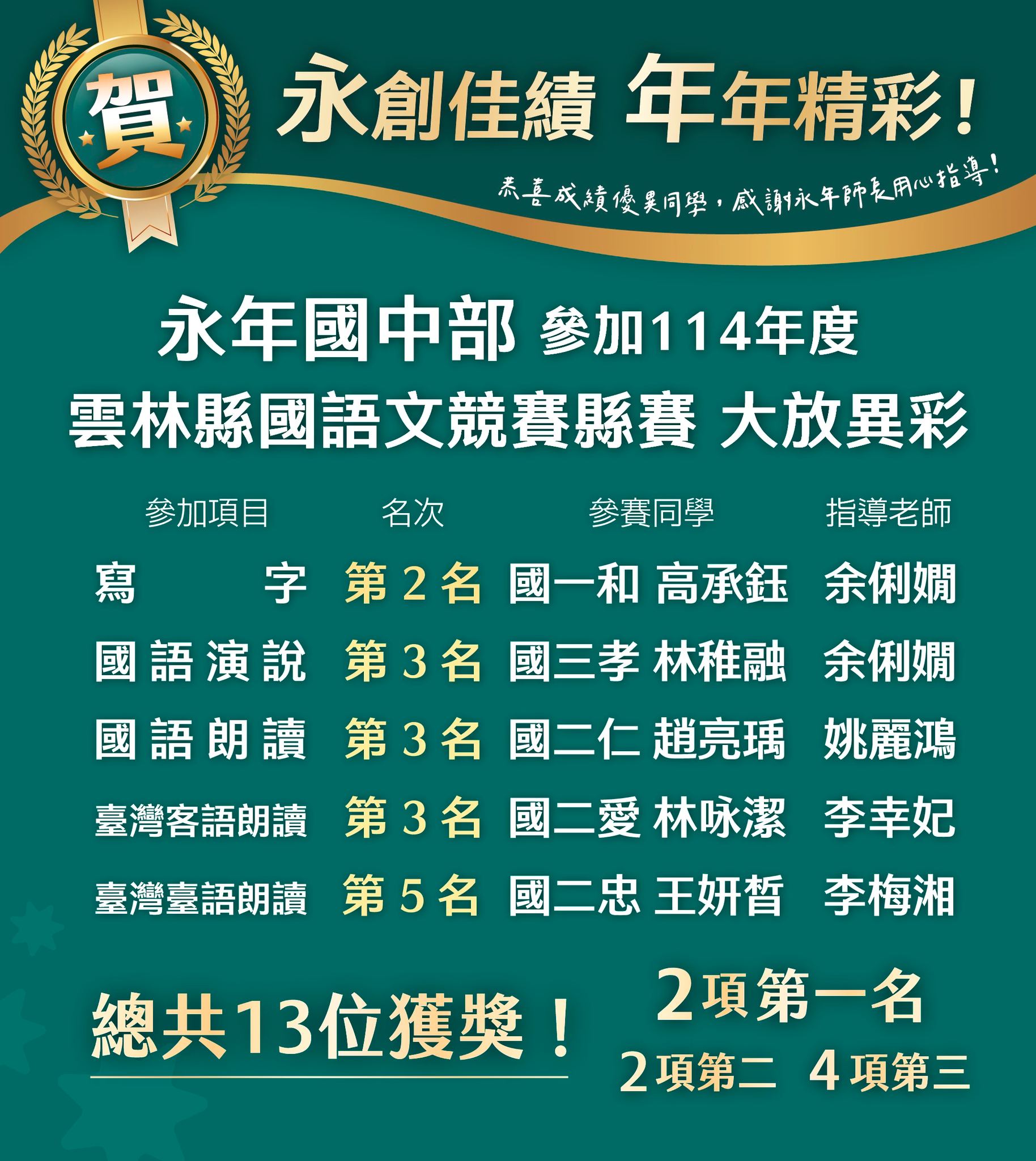 賀! 永年中學參加114年全縣國語文競賽,全校總計13人獲獎,表現亮眼!