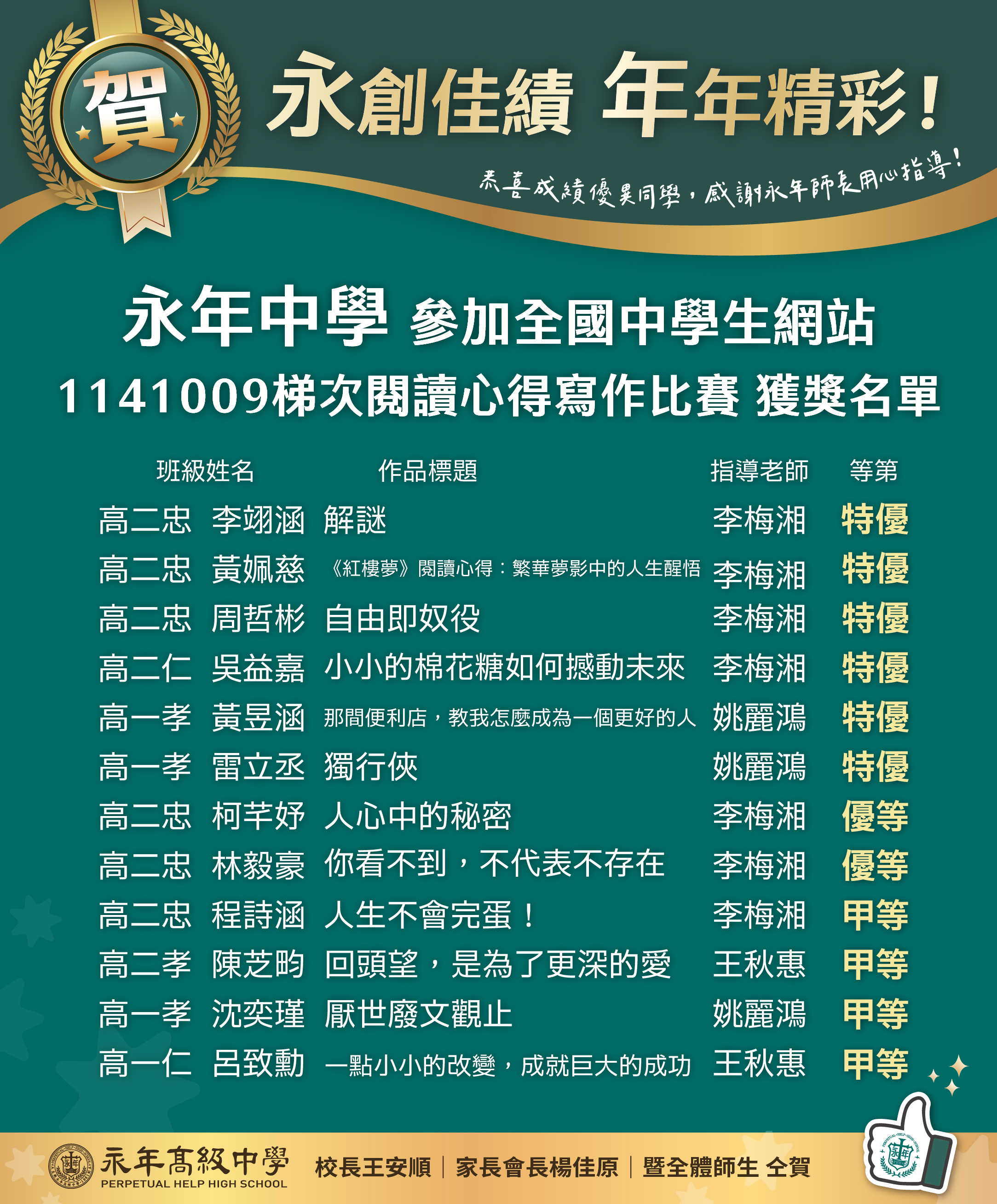 賀!!1141009梯次閱讀心得寫作比賽!本校多位學生榮獲佳績!