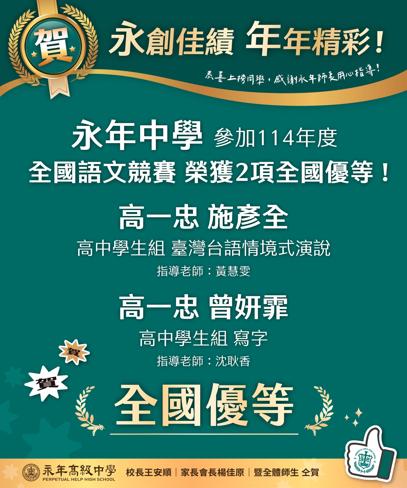 賀! 永年高中代表雲林縣參加114年度全國語文競賽表現傑出,榮獲2項全國優等!
