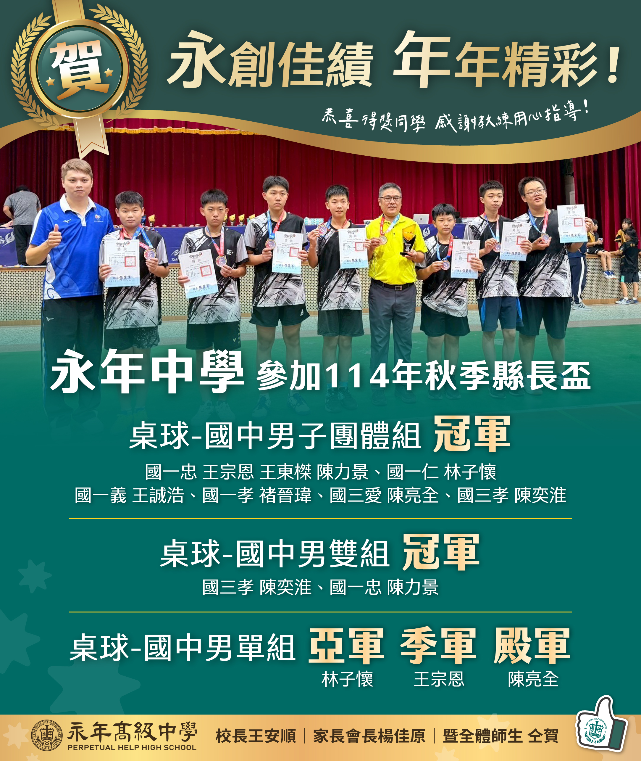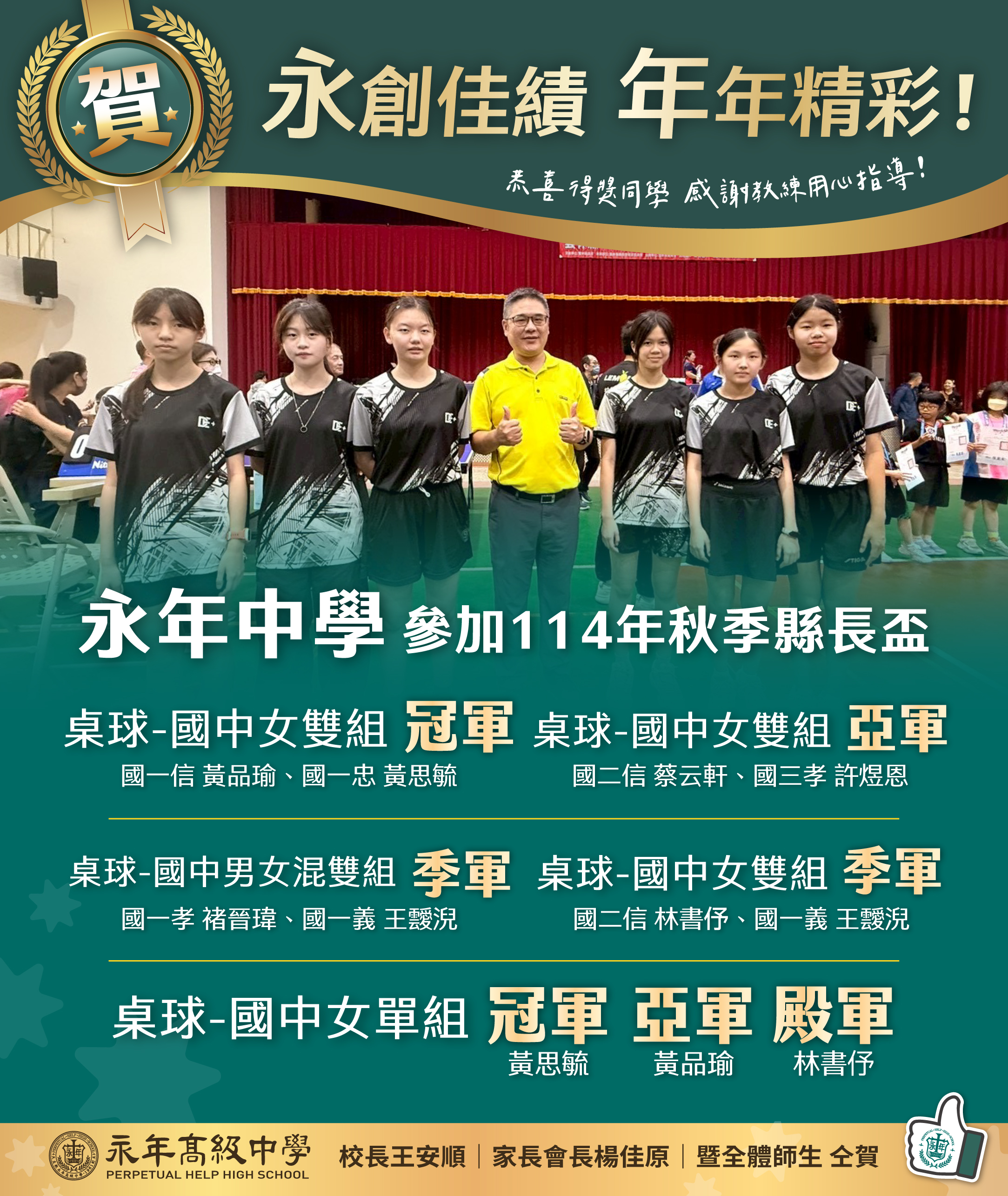 賀!永年中學參加114年秋季縣長盃,榮獲多項冠軍、亞軍、季軍、殿軍!表現亮眼!
