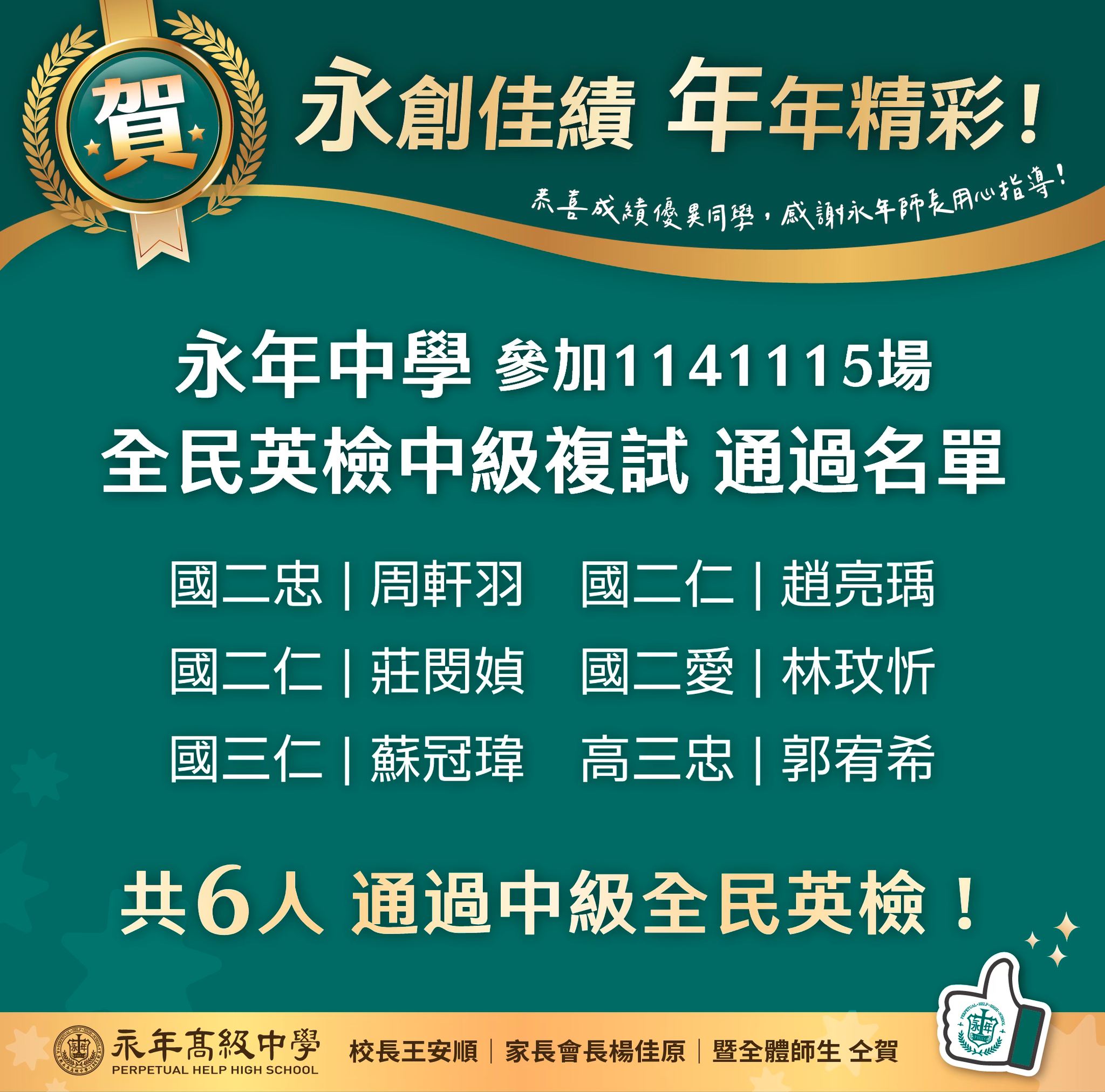 賀! 永年中學參加1141115場全民英檢中級複試測驗,共6人取得中級檢定合格證書!