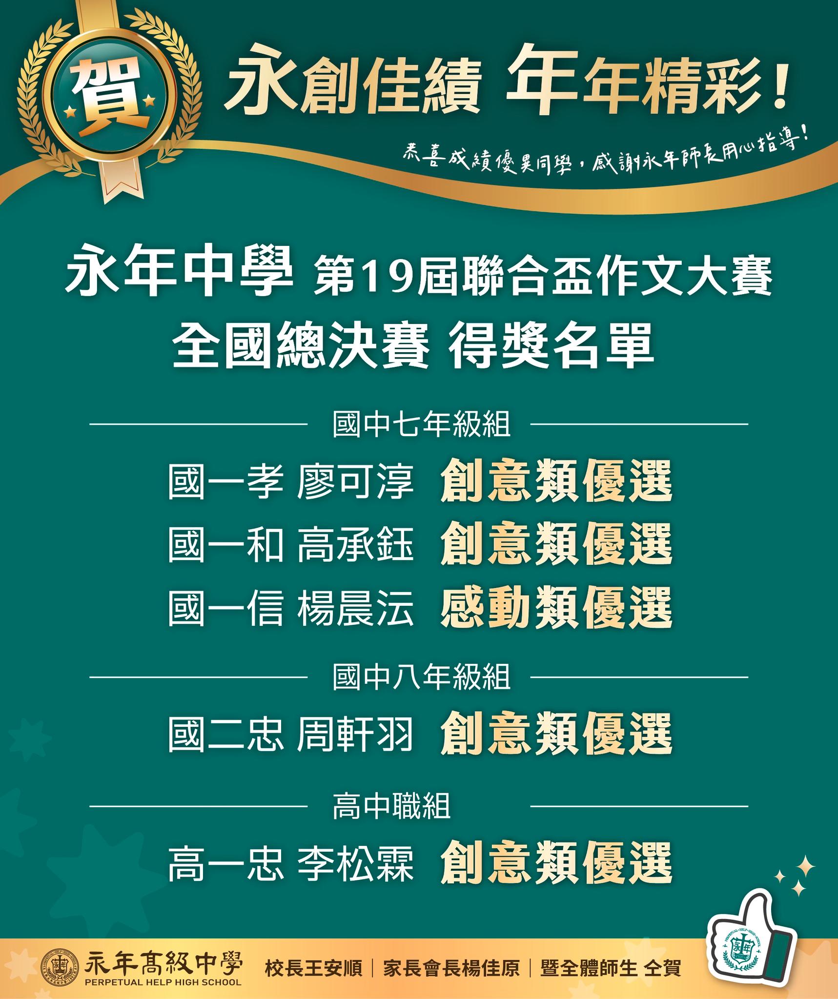 【國中七年級組】創意類優選 國一孝 廖可淳創意類優選 國一和 高承鈺感動類優選 國一信 楊晨沄【國中八年級組】創意類優選 國二忠 周軒羽【高中職組】創意類優選 高一忠 李松霖