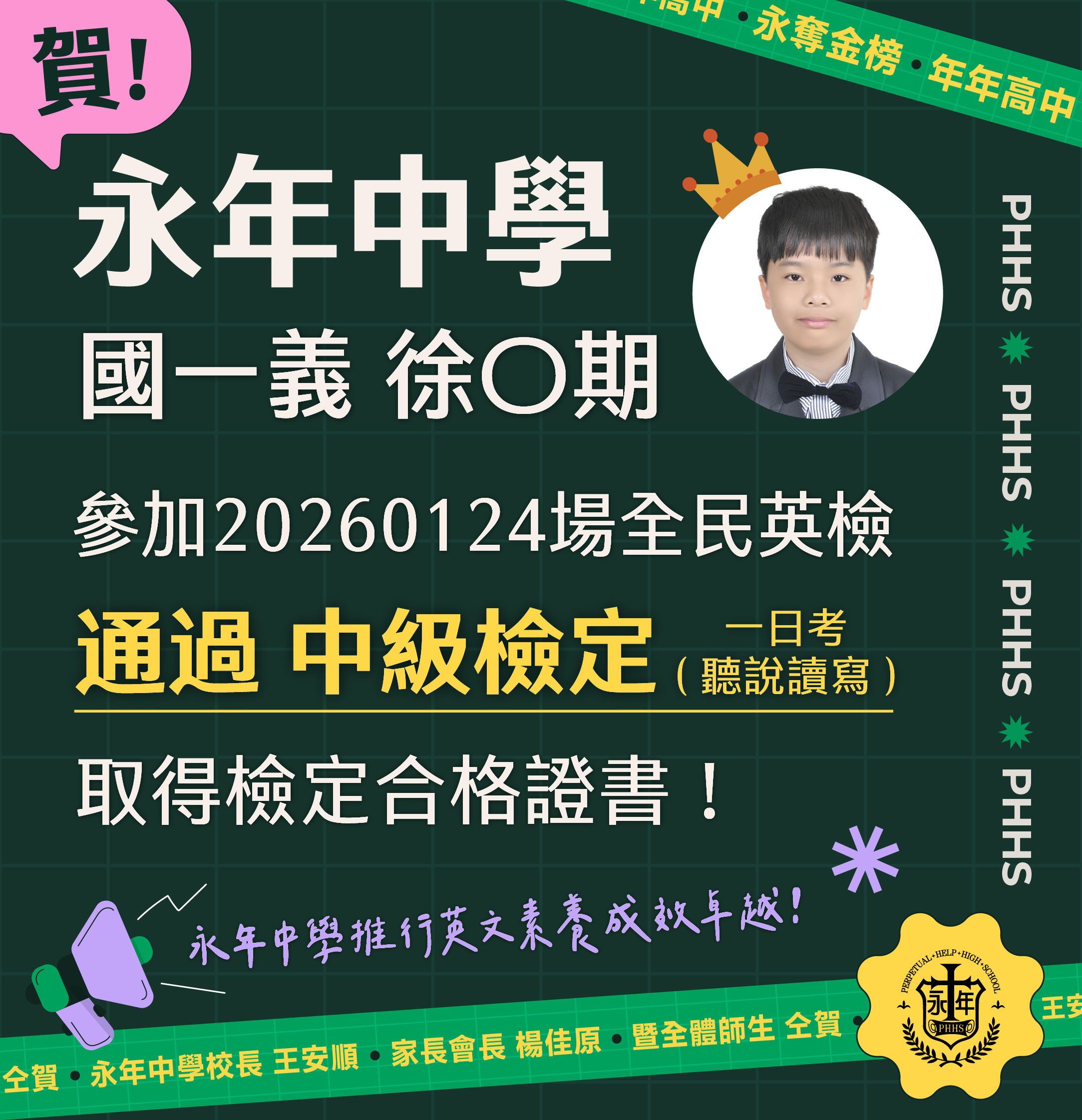 賀! 國一義班徐〇期同學 參加20260124 全民英檢中級一日考(聽說讀寫)測驗,通過中級測驗,取得檢定合格證書!