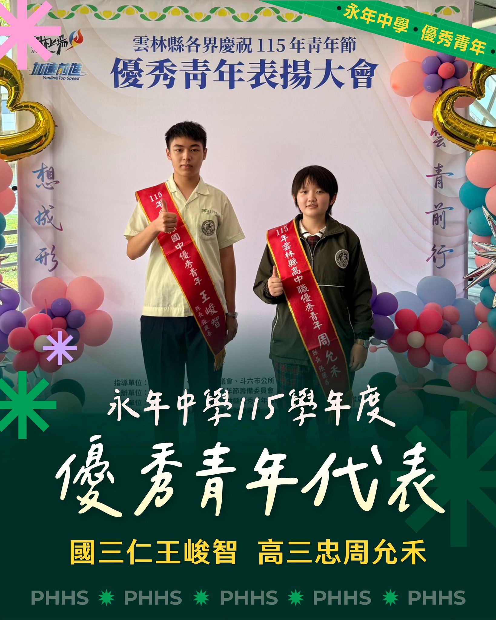 賀! 永年中學國三仁王峻智、高三忠周允禾同學代表本校至縣府接受115年雲林縣優秀青年表揚!