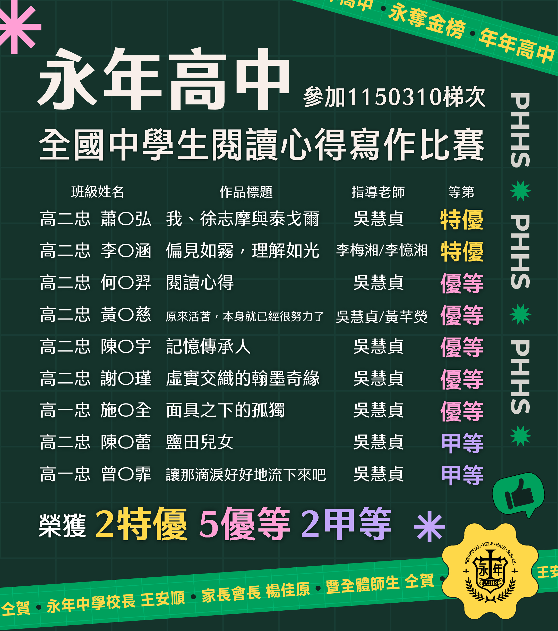 賀!永年中學參加1150310梯次全國中學生閱讀心得寫作比賽,榮獲2特優、5優等、2甲等,表現亮眼!