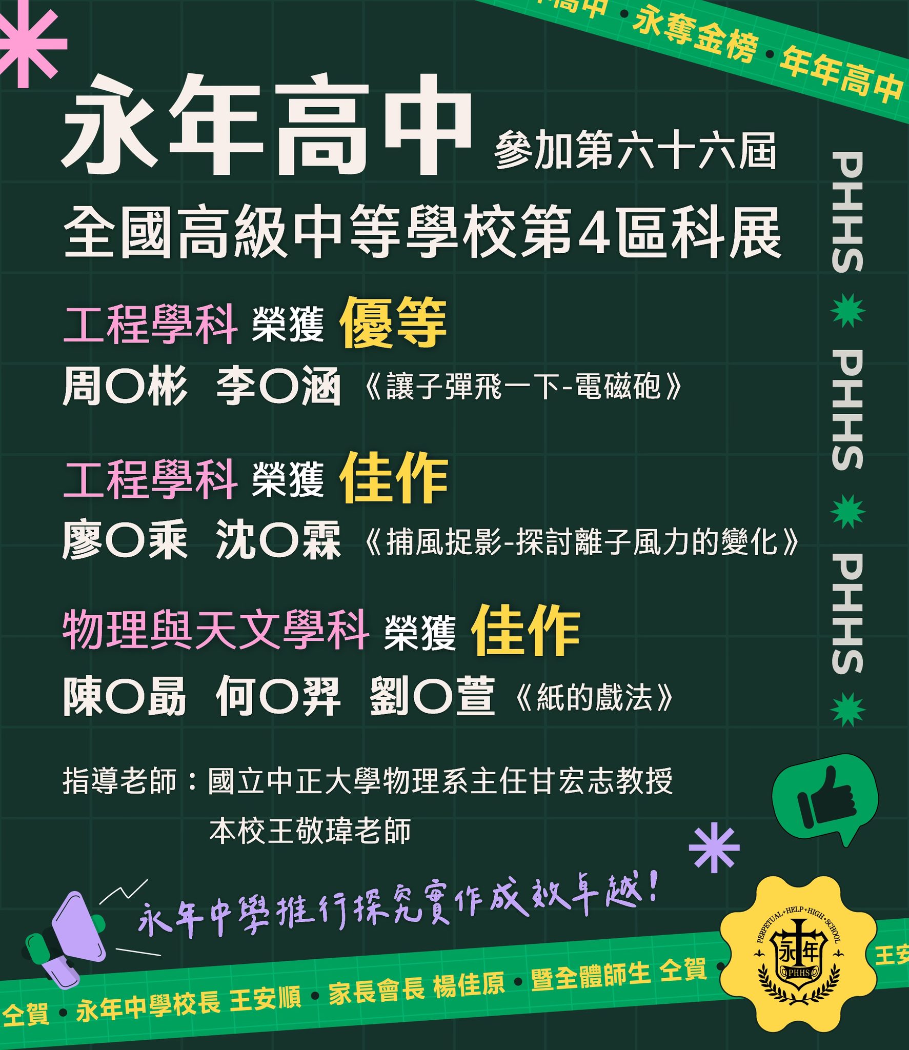賀! 永年中學參加第66屆 #高級中等學校第4區科學展覽會,榮獲1項優等 2項佳作!